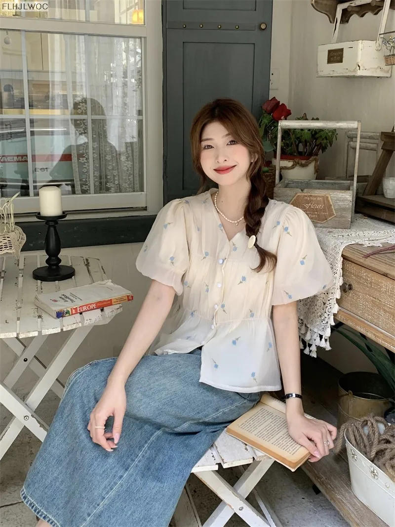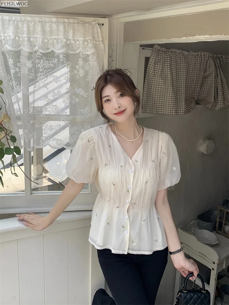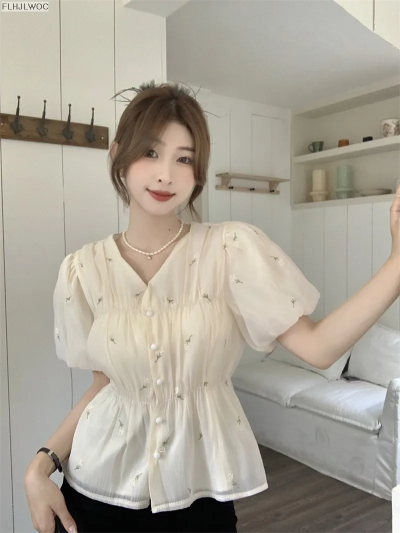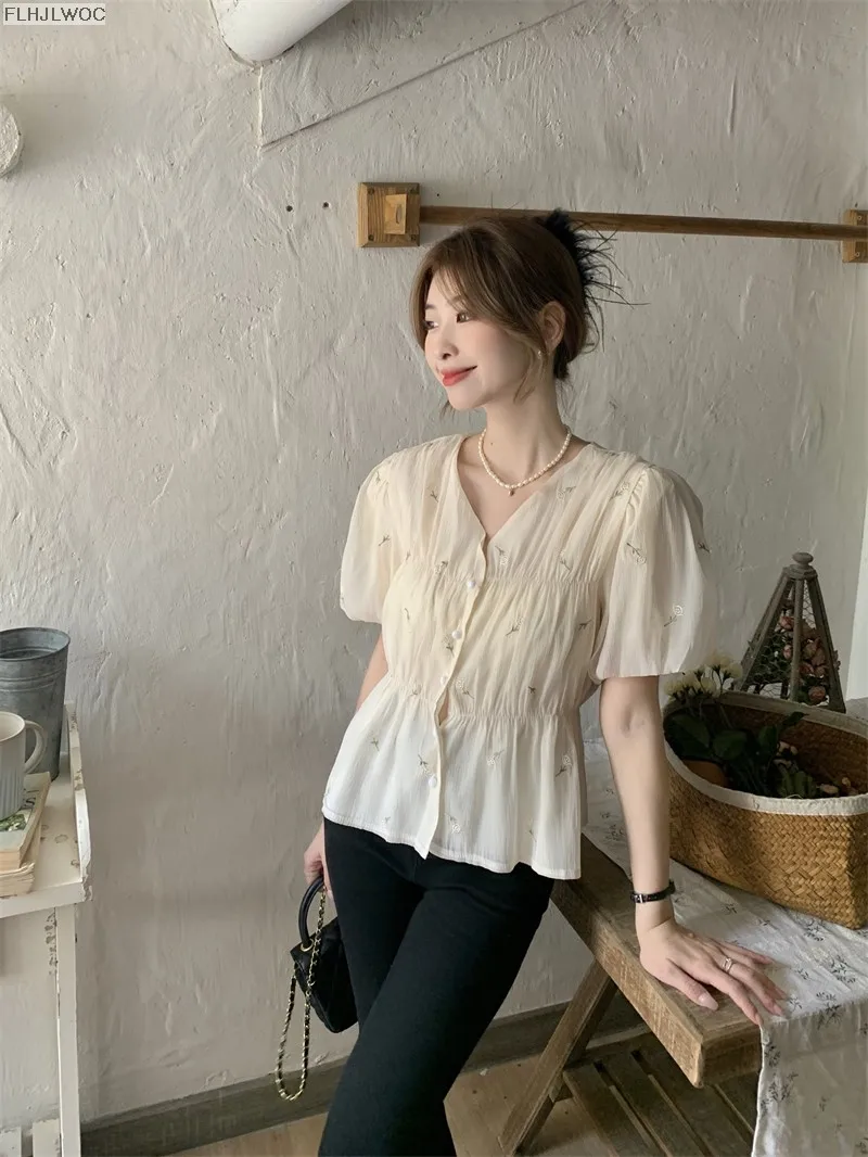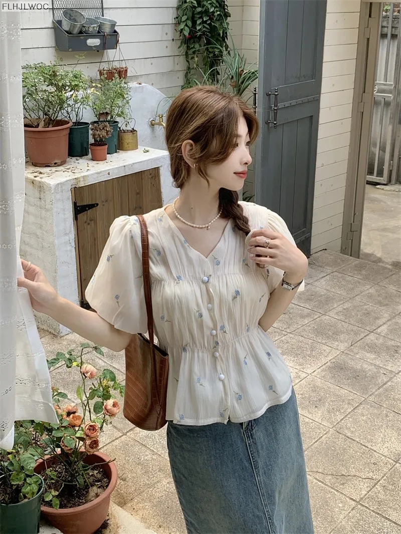 Cute Chic Peplum Tops Women Summer Korea Japan Style Design Slim Waist V Neck Short Flower Shirts Blouses Vintage FLHJLWOC