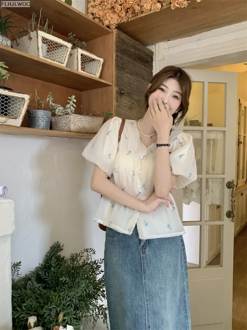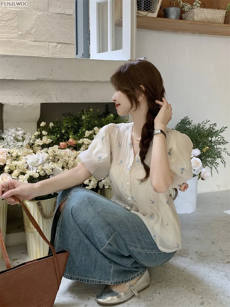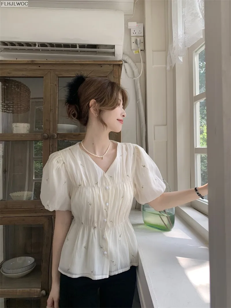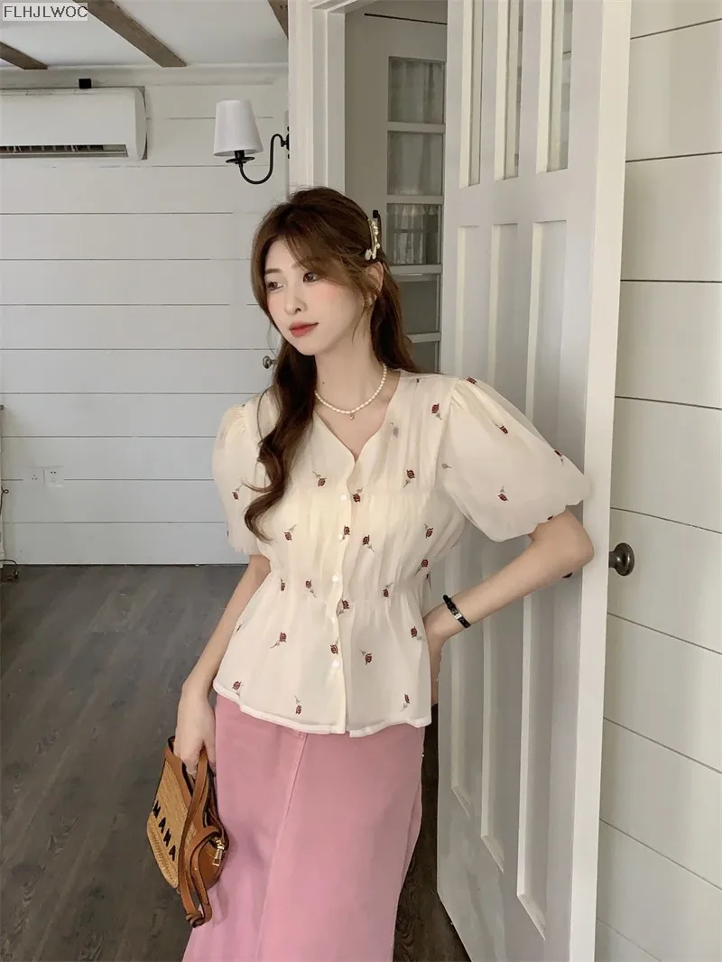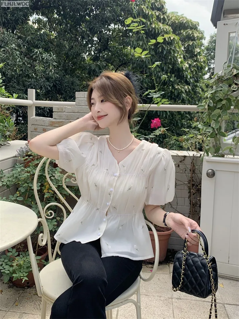 Cute Chic Peplum Tops Women Summer Korea Japan Style Design Slim Waist V Neck Short Flower Shirts Blouses Vintage FLHJLWOC