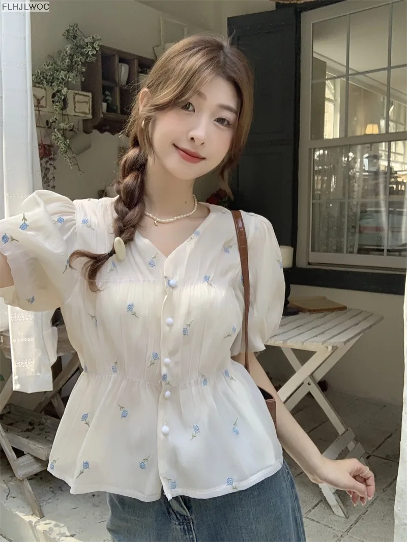 Cute Chic Peplum Tops Women Summer Korea Japan Style Design Slim Waist V Neck Short Flower Shirts Blouses Vintage
