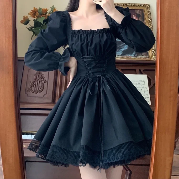 Sweet Puff Sleeve Dress Women Square Neck Kawaii Lace Lolita Dress Japan Cute White Princess Dress Elegant Party Vestidos Y2K