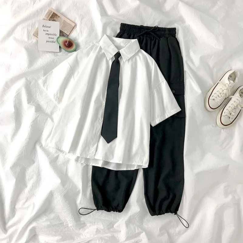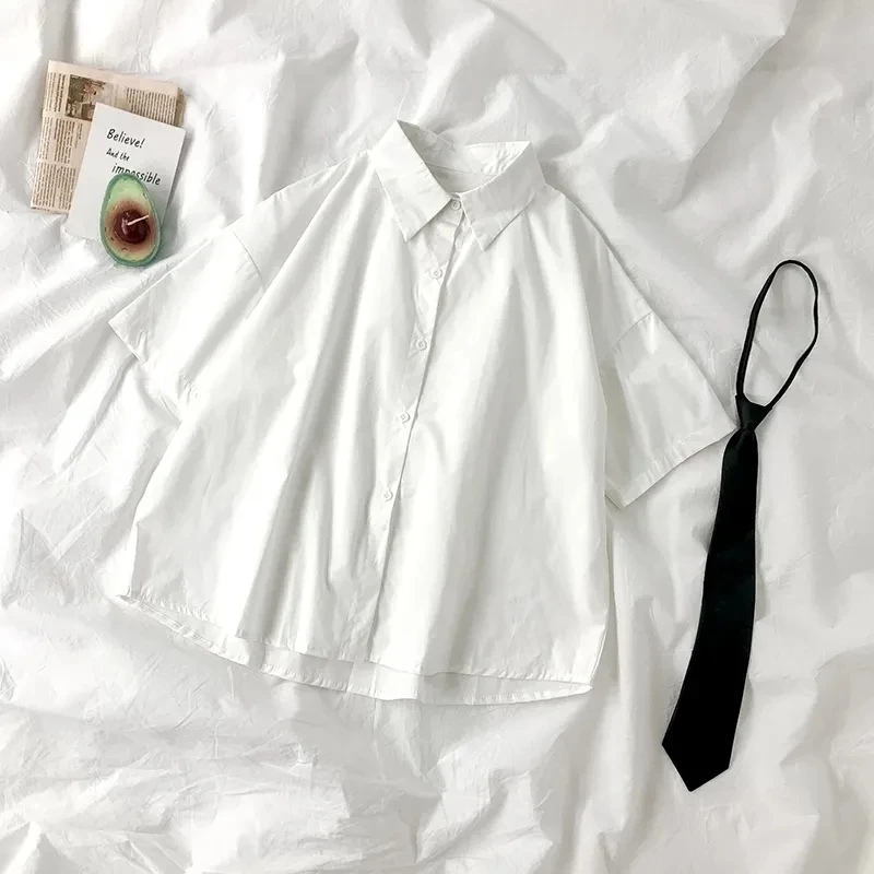 ZOKI White Shirts Women Fashion Black Tie Japan Style Preppy Students JK Girls Blouse Simple Solid Loose Summer Button Up Tops